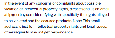 In the event of any concerns or complaints about possible violation of intellectual property rights, please send us an email at ip@scrbay.com, identifying with specificity the rights alleged to be violated and the accused products. Note: This email address is just for intellectual property rights and legal issues, other requests may not get respondence.